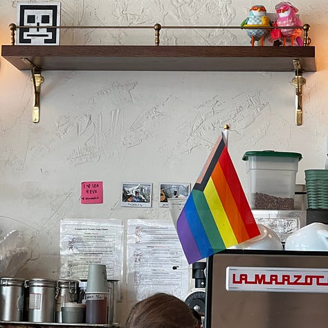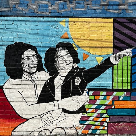 Little Tart. Rows of beautiful pastries. I chose a corn quiche and a large latte. “Is dairy milk okay?” she asked. Inside: old brick, peeling plaster, exposed pipes. Sunflower murals in orange and green. Casual, intentional. It reminded me of my old West Village haunts—the same buzz, the same hum of possibility.